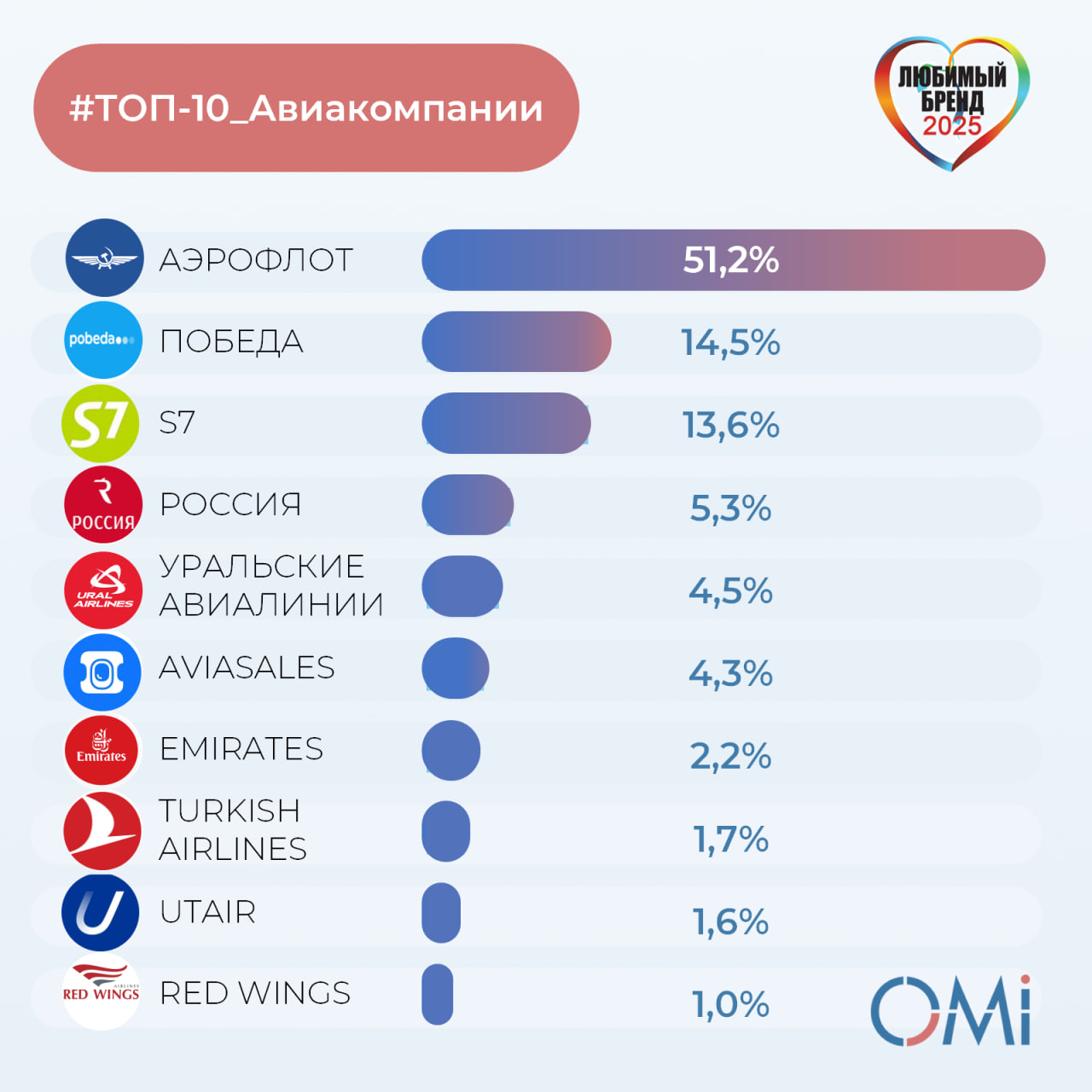 В опросе принимали участие респонденты, совершавшие авиаперелеты в течение последнего года на момент проведения опроса. Подробнее смотрите на сайте рейтинга любимых брендов россиян от OMI.