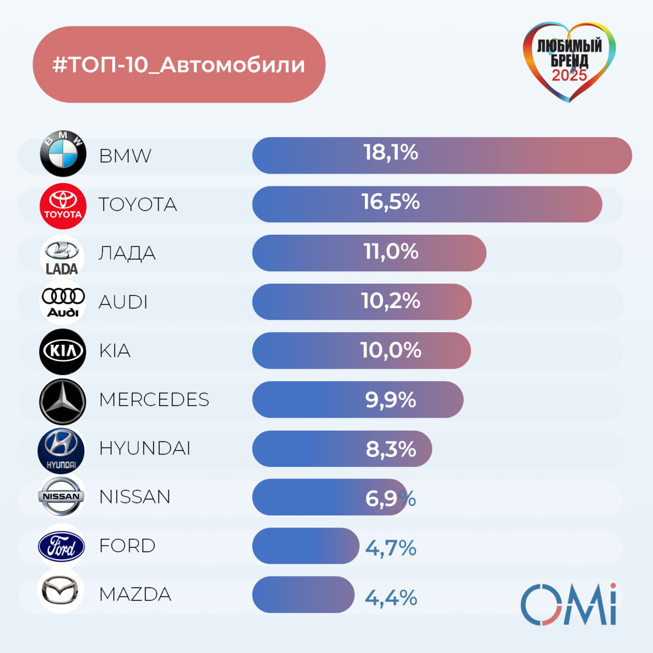 В категории «Автомобили», ушедшие из России бренды всё ещё любимы. Но в тройке лидеров изменение: на третьем месте в 2025 году российский бренд ЛАДА.