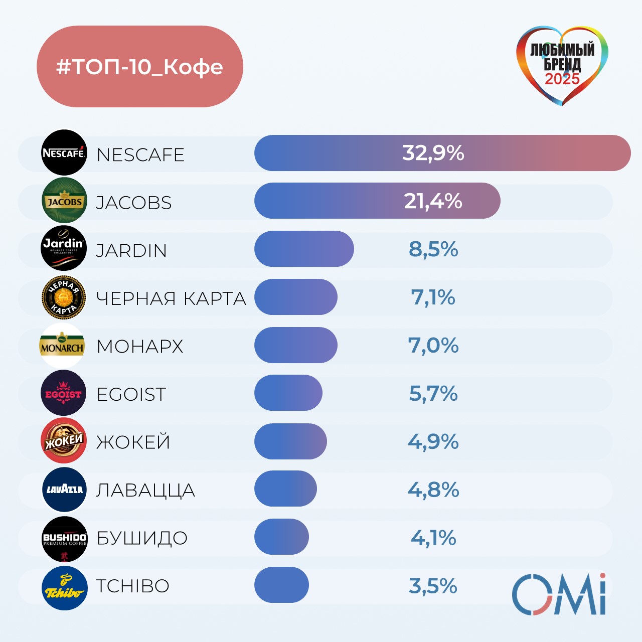 В опросе принимали участие респонденты, покупавшие кофе в течение последнего месяца на момент проведения опроса. Подробнее смотрите на сайте рейтинга любимых брендов россиян от OMI.