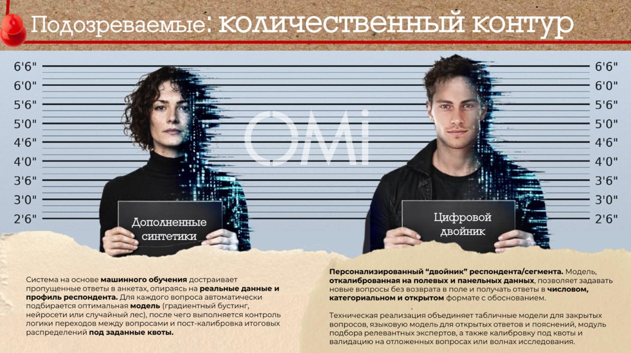 Персонализированный «двойник» респондента/сегмента. Модель, откалиброванная на полевых и панельных данных, позволяет задавать новые вопросы без возврата в поле и получать ответы в числовом, категориальном и открытом формате с обоснованием. Техническая реализация объединяет табличные модели для закрытых вопросов, языковую модель для открытых ответов и пояснений, модуль подбора релевантных экспертов, а также калибровку под квоты и валидацию на отложенных вопросах или волнах исследования.